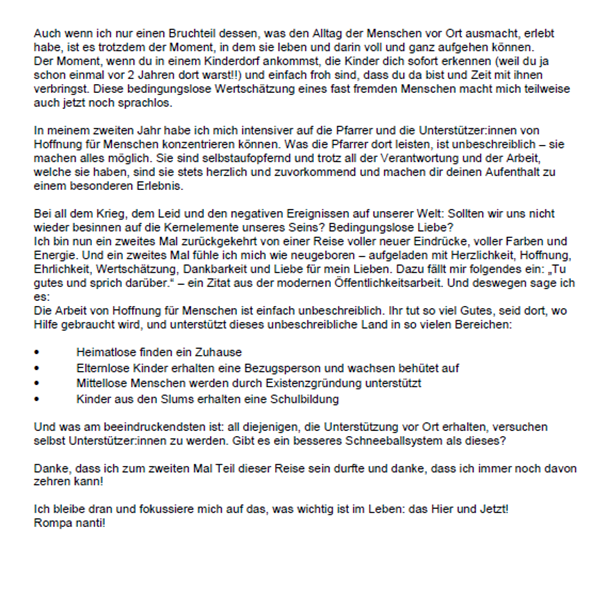 Die Reise bot einen intensiven Einblick in unsere Projekte und zeigte eindrucksvoll, dass die gespendeten Gelder direkt und zu 100 % den Menschen zugutekommen, die unsere Unterstützung dringend brauchen.